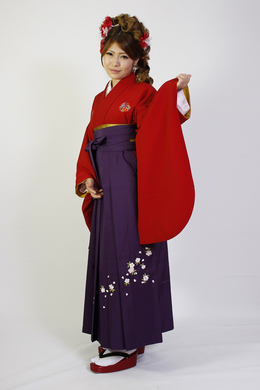 シンプルな赤地の二尺袖に、かわいらしい桜の刺繍入りの袴をコーディネート。スッキリとしていて大人っぽい印象を与えます。